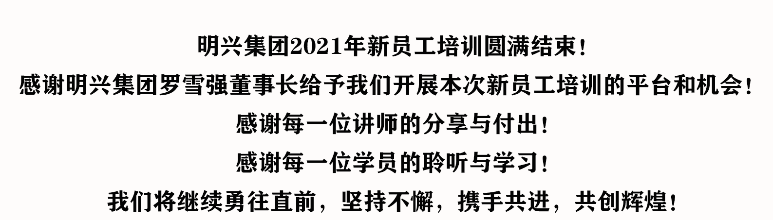 明興商學院--掛牌成立于2019年,羅雪強董事長任校長,為滿足集團戰(zhàn)略發(fā)展的需要及員工職業(yè)發(fā)展需求,集團13大子公司領(lǐng)導人講師團隊正一步步發(fā)展壯大,培訓機制日益成熟。學院成立以來,已為公司培養(yǎng)出眾多優(yōu)秀學員,為公司發(fā)展提供源源不斷的后生力量。